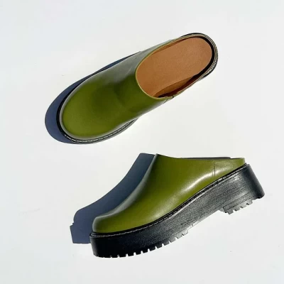Green Round Toe Chunky Heel Slip-On Platform Mules for Women
