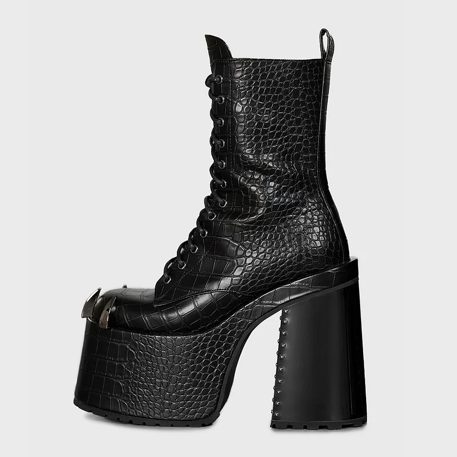 Gold Croc Embossed Side Zipper Studded Platform Ankle Boots