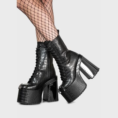 Black Round Toe Croc Embossed Lace-Up Fang Accent Platform Booties